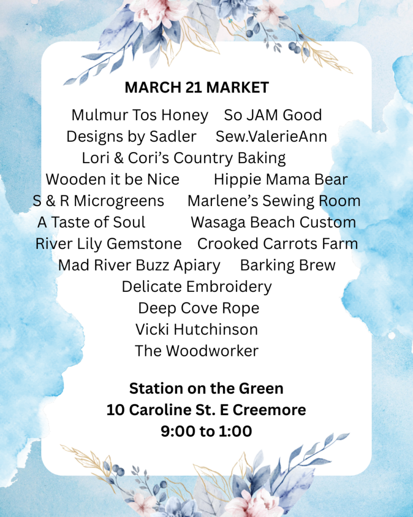 March 21admin_marketmanagerFebruary 23, 2026Updates Our next indoor market at the Station on the Green in Creemore, is Saturday, March 21 from 9:00 until 1:00.
